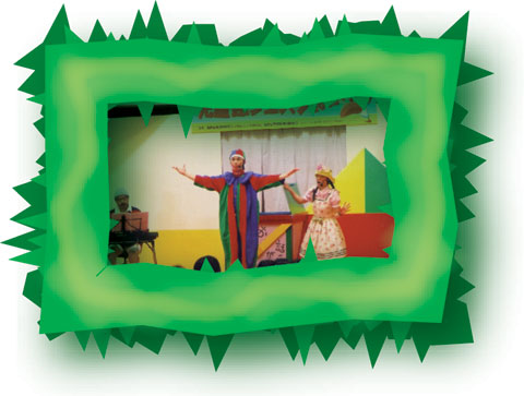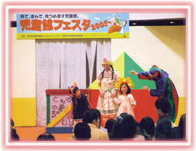 | 絵本でよく知られているグリム童話『おおかみと七ひきの子やぎ』の世界を 創作ミュージカルで綴り、子ども達の想像力を引き出しながら、ゆかりんが会場いっぱい動き回ります。 そして、一人で「おおかみ」「おかあさん」「子やぎ」を演じるゴマパンが不思議な笑いの世界に導きます。 子ども達はハラハラ・ドキドキしながら、自分にしか見えないおおかにや、子やぎを想像していつしか物語の中に入っているのです。 シンセサイザーの効果的な演奏もお話のリズムを楽しく作っています。 | ![]() |