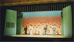 その場面、場面に合わせた照明シーンを作ります。 トップサス等を使い目立たせたい出演者を浮かび上がらせたり、夜のシーン等では、ピンスポットにも薄いブルー等をしようして その時のシーンに合わせた自然な照明演出を致します。 |