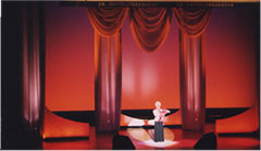 照明で曲に合わせた雰囲気を創りピンスポットで本人の表情や衣装を引き立て、舞台美術等に照明をあてたり電飾等を使って、よりいっそう曲の雰囲気を高めます。 |