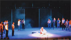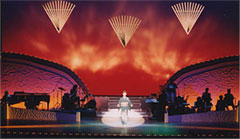 照明の仕事: 舞台での演劇、日本舞踊、ダンス、ホテルでのパーティー、ディナーショーから野外でのコンサートなど様々です。 照明家はそうした作品の内容にあわせて明かりをつくるものですが、ジャンルや内容によっては、使用する機材やセッティング 方法も異なりますし求められる表現方法もさまざまです。 下記では舞台で行われるものから、式典、野外コンサート等までの様々なライティングの実例を紹介させていただきます。 |