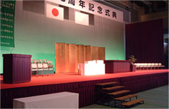 会館等で行われる式典は付属の照明を使用して出来ますが、体育館などの付属の照明があまりない場合は、 仮設の証明を設営して看板や国旗当て前明かり等を作ります。 |