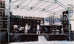 野外イベントでは仮設の照明になります。 その際には大容量の仮設電源機(ジェネレーター等)が必要となります。 イントレやトラスを照明の吊り込み用として使用し、持ち込みの仮設照明機材を使用して 野外コンサートからお祭りまでそれぞれに合わせた照明演出をします。 |